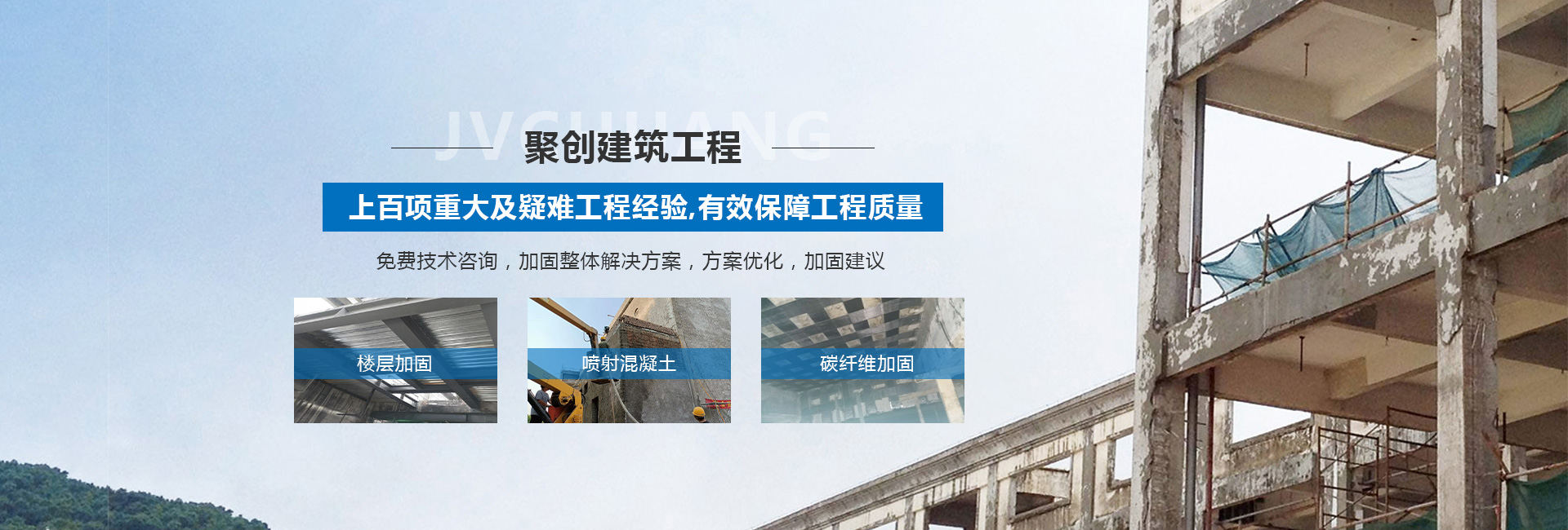 山西聚創(chuàng)建筑工程技術有限公司是一家涉足建筑工程改造加固、基礎加固、樓房糾偏、橋梁結構加固補強、鋼結構加固與安裝、靜力切割拆除、樓房增層、抗震加固、裝飾工程、工程檢測、設計、加固材料產品研發(fā)和新技術推廣或技術咨詢服務型加固企業(yè)等諸多領域。
